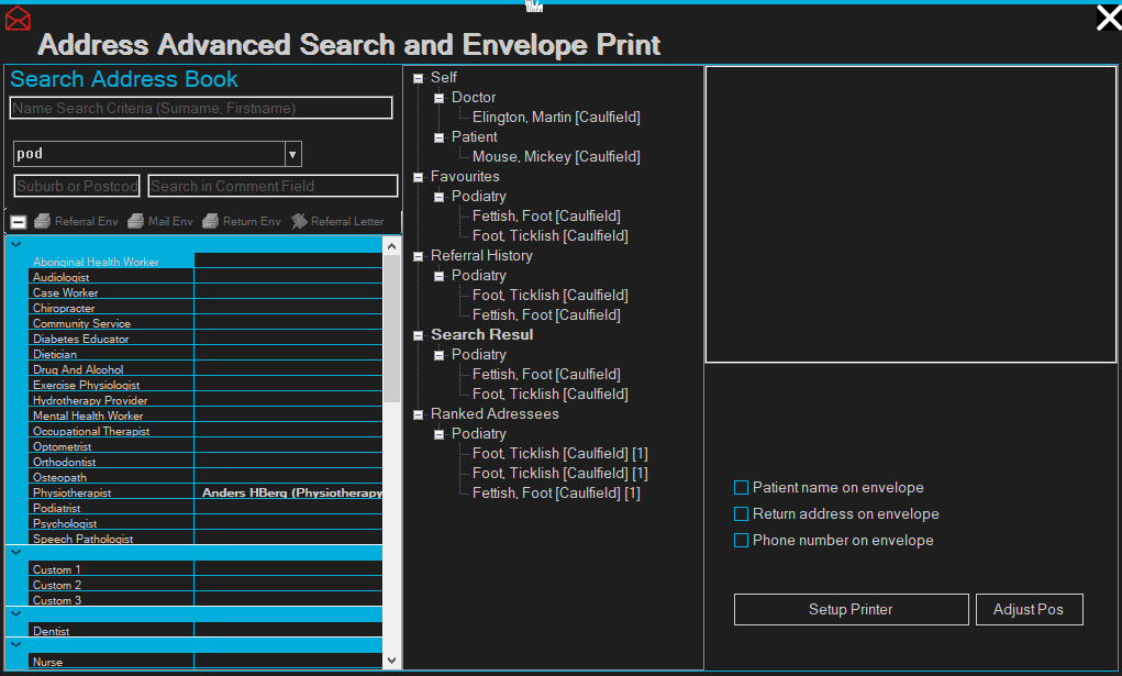 Other features of the envelope printer include advanced search, access to DCP consultants saved to patient in PCD's, patient referral history, copy address, and map address from patient home using google .